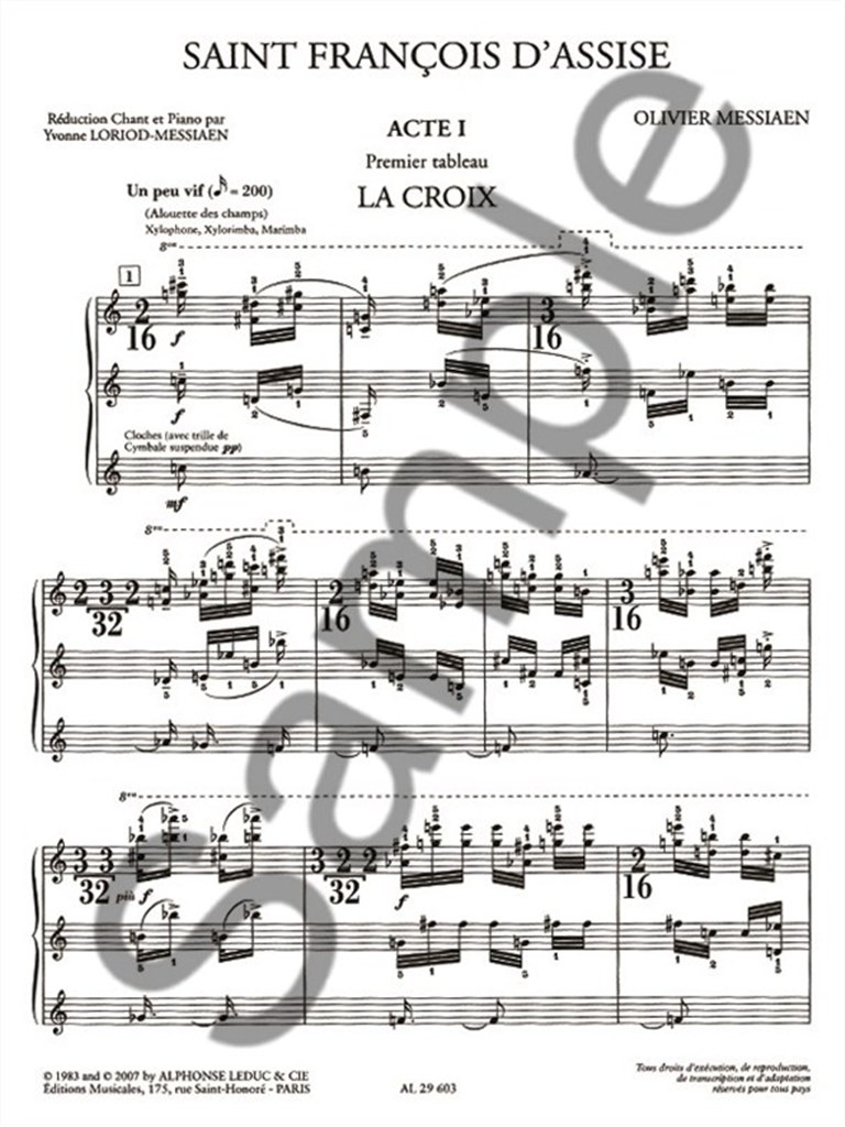 Saint Francis of Assisi is an opera in 3 acts by Olivier Messiaen. This first volume is focused on the Act 1 & 1. La croix, 2. Les laudes, 3. Le baiser au lepreux. It depicts the moments when Saint Francis explains what is the 'Perfect Joy' according to the love of the Christ, his request to God to meet a leper and to be able to love him, and, finally, his meeting with a leper, assisted by an Angel. The leper is cured from this meeting. Based on the life of Saint Francis of Assisi, this opera is set in Italy and is composed as per below: Act I: 1. La croix 2. Les laudes 3. Le baiser au lepreux Act II 4. L'ange voyageur 5. L'ange musicien 6. Le prêche aux oiseaux Act II 7. Les stigmates 8. La mort et la nouvelle vie This opera was played at the Paris Opera in 1983. Olivier Messiaen (1908-1992) was a French organist and composer passionate about Ornithology and one of the most important composers of his century. Inspired by Japanese music, he had a very special way of composing and his work can be identified by its complexity, its diatonic aspect, its harmony with limited transposition, its colour and its additive rhythms. He composed many works related to ornithology and birdsong, including the 'Bird Catalogue' in 7 volumes and the 'Treatise on rhythm, colour and ornithology' in 7 volumes.