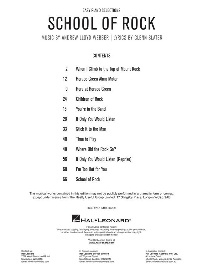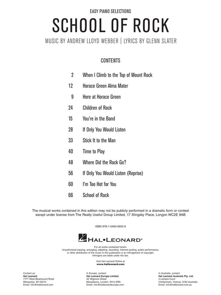 A dozen easy piano arrangements from the Tony Award-nominated 2015 musical adapted from the popular 2003 silver screen production of the same name. Our folio includes the new songs with music by Andrew Lloyd Webber and lyrics by Glenn Slater and the title track by Mike White and Samuel Buonaugurio.