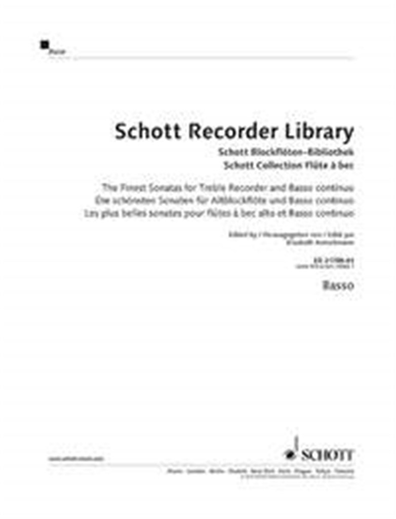 The Schott Recorder Library anthology is a varied compilation of the most beautiful Baroque sonatas for treble recorder and continuous bass. This volume contains several beautiful sonatas of major composers like Georg Philipp Telemann or Georg Friedrich Handel, among others. It provides comprehensive material for lessons or concerts, ranging from musically charming pieces of moderate difficulty to demanding compositions of tonal splendour. The compositions contained in this anthology are the most popular works from the successful 'Originalmusik für Blockflöte' (OFB) series published by Schott for more than 50 years.