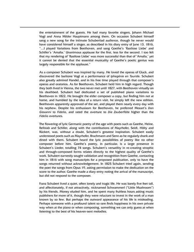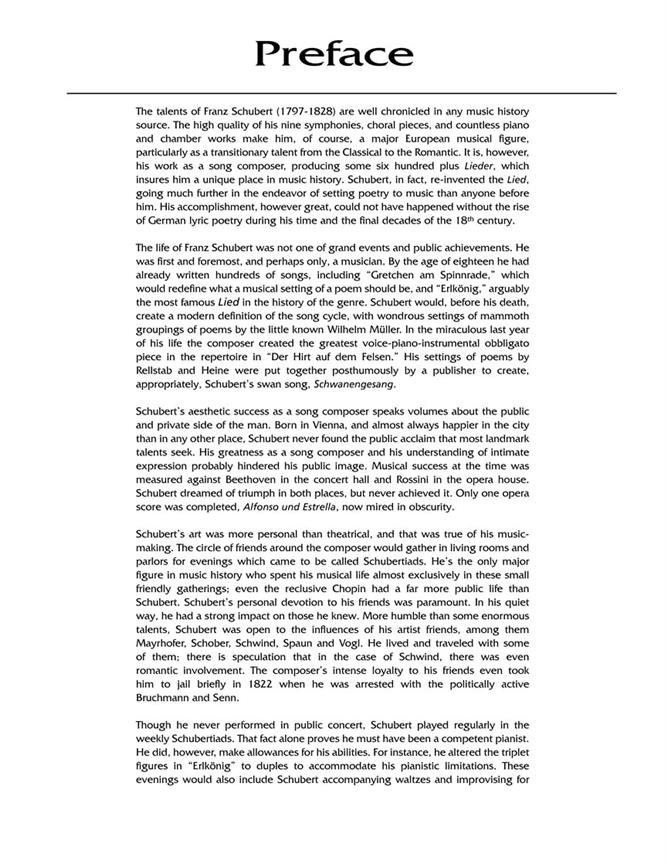 La collection plus utile de chansons de Schubert disponibles ! Contrairement aux éditions internationales, ces recueils de nouvelles chansons contiennent seulement quelques chansons préférées de Die Schöne Müllerin et Wintereisse Die, plutôt que les cycles de la chanson entière rarement utilisé - laisse place à de nombreuses chansons individuelles plus merveilleuses normalement pas trouvé dans les collections de Schubert. Comme dans les autres volumes dans la bibliothèque Vocal, chaque chanson comporte des notes introductives, y compris des informations sur la composition, le contexte biographique de la chanson dans la vie de Schubert, des performances précoce et des commentaires à propos de poètes. Le contenu des éditions voix haute et basse voix est presque les mêmes : le volume de la voix haute comprend typiquement Der Hirt auf dem Felsen (avec une partie de la clarinette amovible) et Auf dem Strom (avec une partie de la corne amovible) - le volume de la voix de basse comprend uniquement les Das Abendrot et Romanze. La couverture est ornée d'une aquarelle de 1821 charmant illustrant de Schubert et ses amis à une rassemblement à Atzenbrugg d'été. Toutes les chansons ont été nouvellement ed...