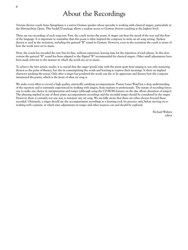 Avec les cours de diction enregistrés par Irene Spiegelman, professeur de diction allemende au Metropolitan Opera, et l'accompagnement piano enregistré par Laura Ward, cette sélection des chansons de Schubert est une excellente introduction.