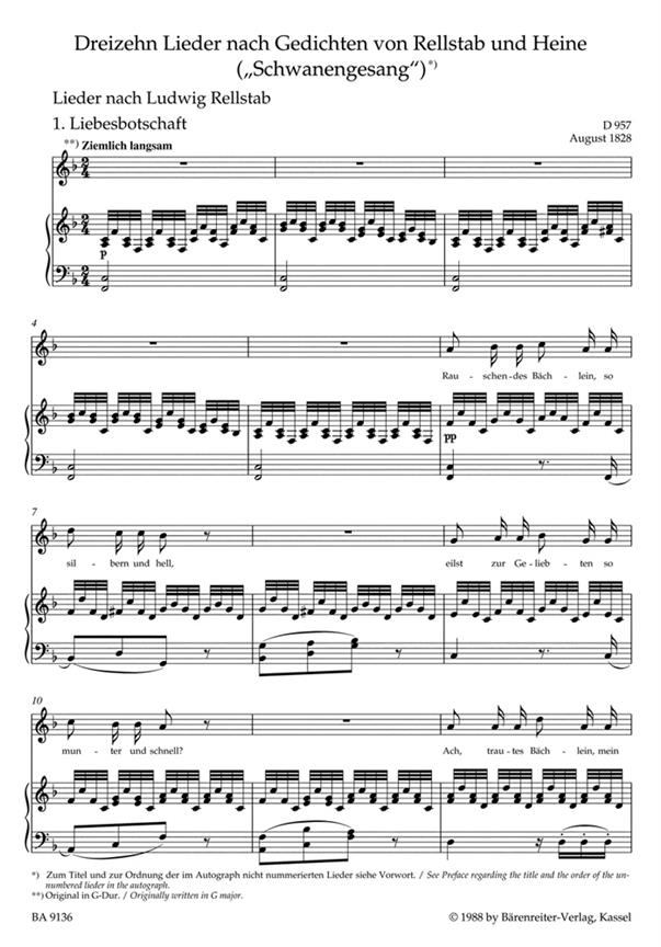 Au cours de sa durée de vie de Schubert effectivement voulu publier les deux groupes de Lieder séparément. Toutefois, les chansons de Heine et Rellstab sont en effet étroitement liés. Haslinger ajouté quatorzième Lied, "Die Taubenpost", basée sur un texte de Johann Gabriel Seidl, que Schubert avait composé un mois avant sa mort, mais qui en aucun cas met à nu toute relation à l'Rellstab et Heine Lieder.