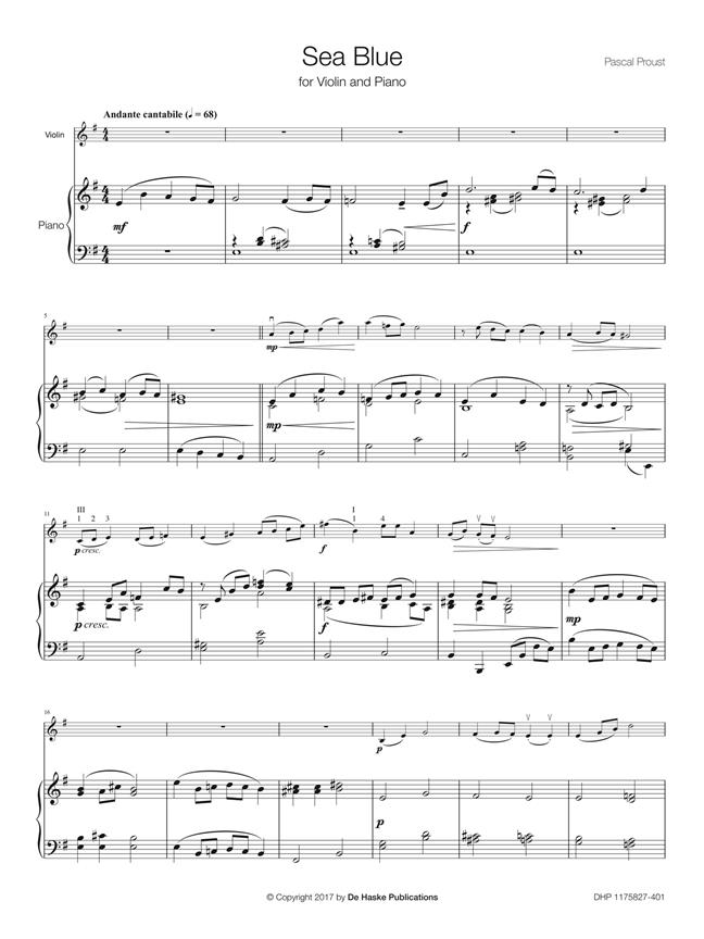 Le compositeur Pascal Proust puise à volonté dans son immense expérience de musicien et professeur de musique - son catalogue d'oeuvres englobe plusieurs centaines de compositions pour divers instruments. Il a notamment écrit Sea Blue pour violonistes ayant environ 3 à 4 années de pratique, dans un style musical accessible et coloré. De ce fait, Sea Blue est la pièce idéale pour tout examen ou audition de jeunes musiciens.