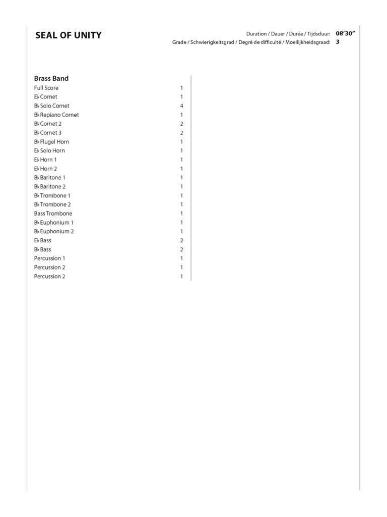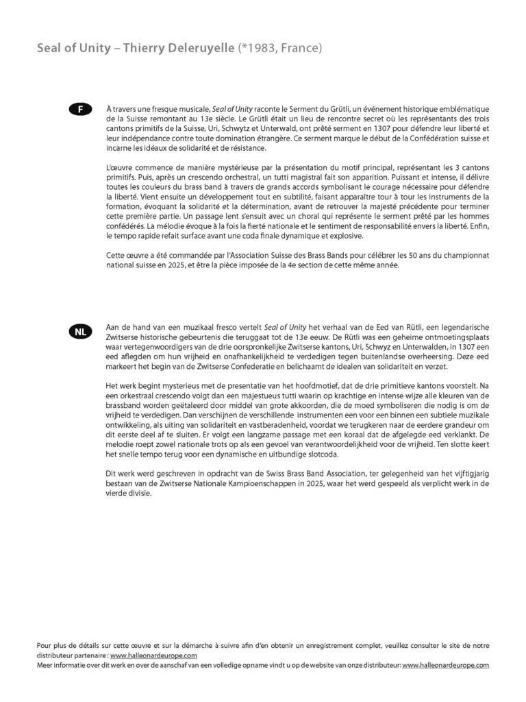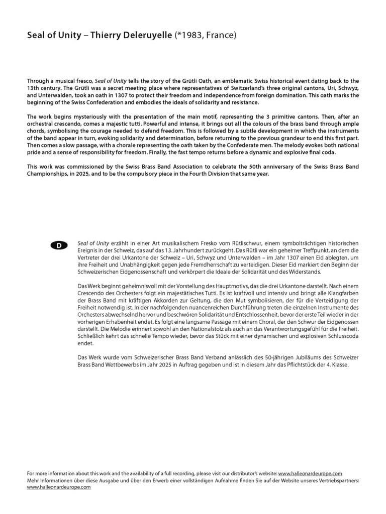 À travers une fresque musicale, Seal of Unity raconte le Serment du Grütli, un événement historique emblématique de la Suisse remontant au 13e siècle. L'œuvre commence de manière mystérieuse par la présentation du motif principal, représentant les 3 cantons primitifs. La pièce délivre ensuite toutes les couleurs du brass band, faisant apparaître tour à tour les instruments de la formation. Après un choral lent, le tempo rapide revient avant une coda dynamique et explosive.