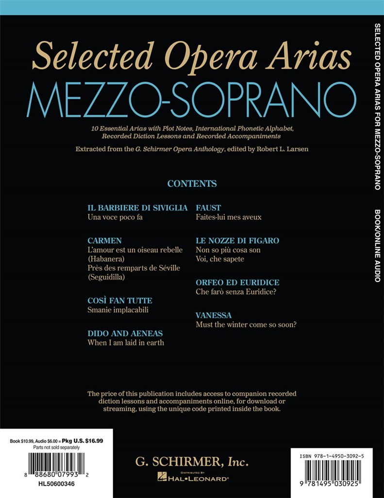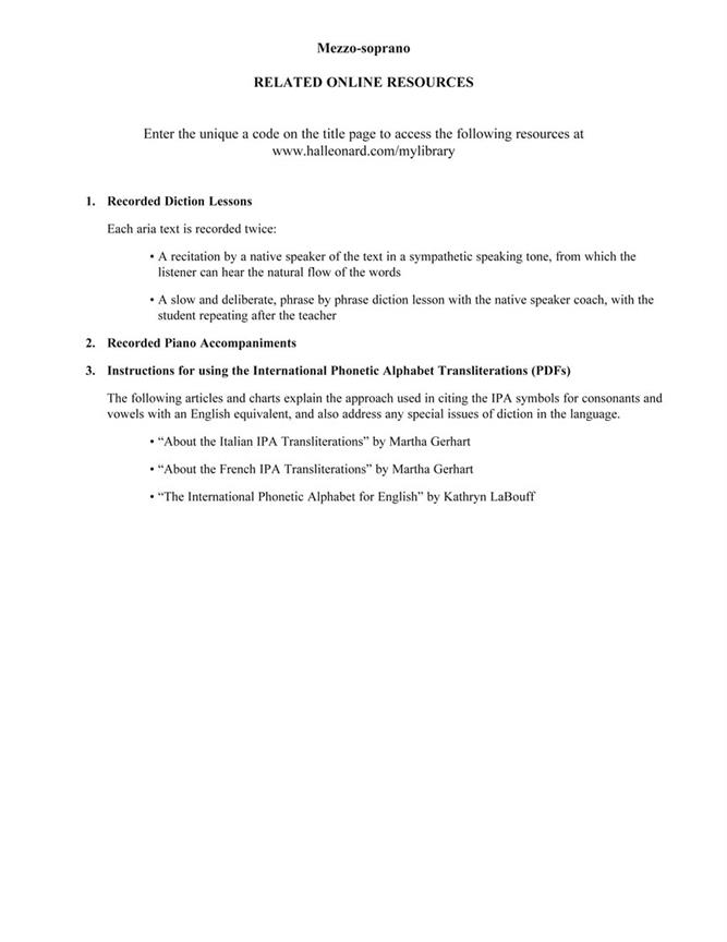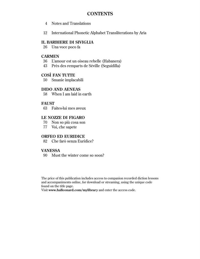 Beaucoup d’étudiants n’ont besoin que de quelques airs d’opéra dans leur étude vocale. Selected Opera Arias extrait 10 airs utiles à l’étudiant de chant typique de l’anthologie G. Schirmer Opera, avec des notes d’intrigue, des traductions et des API (API), et les combine avec les leçons de diction enregistrées par les meilleurs entraîneurs de New York, ainsi qu’avec les accompagnements enregistrés par les coachs du personnel de Lyric Opera of Chicago. L’élève en chant bénéficie d’un ensemble complet et à prix abordable pour offrir la meilleure formation.