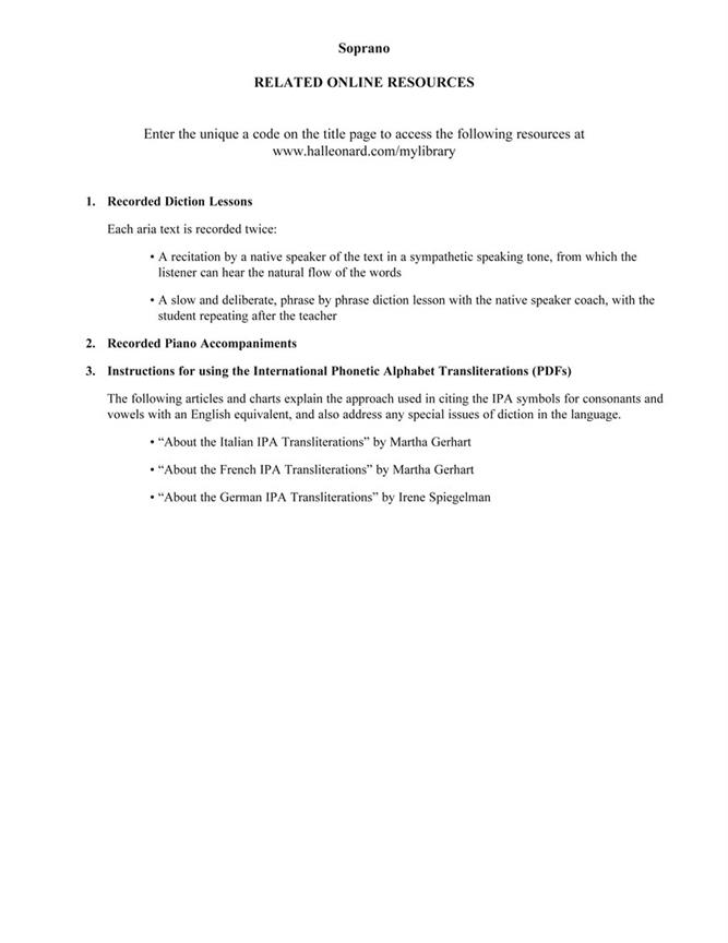 Beaucoup d’étudiants n’ont besoin que de quelques airs d’opéra dans leur étude vocale. Selected Opera Arias extrait 10 airs utiles à l’étudiant de chant typique de l’anthologie G. Schirmer Opera, avec des notes d’intrigue, des traductions et des API (API), et les combine avec les leçons de diction enregistrées par les meilleurs entraîneurs de New York, ainsi qu’avec les accompagnements enregistrés par les coachs du personnel de Lyric Opera of Chicago. L’élève en chant bénéficie d’un ensemble complet et à prix abordable pour offrir la meilleure formation.