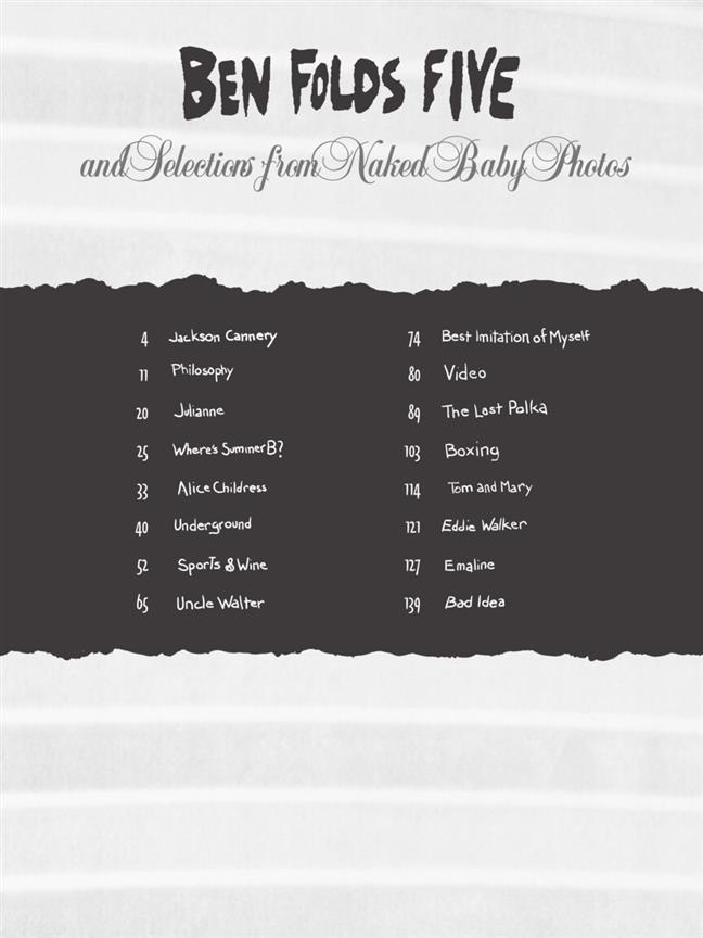 Ce volume contient toutes les chansons de Ben Folds Five plus une sélection de Naked Baby Photos, transcrites pour voix, basse (Tablature et notation standard), piano, batterie et percussions