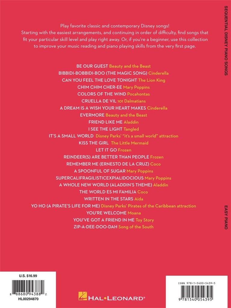 Players of all levels can enjoy their favorite hits with Sequential Disney Piano Songs! Starting with the easiest arrangements (hands alone, very simple rhythms), and continuing in order of difficulty (including hands together, syncopated rhythms and moving around the keyboard), players can find songs that fit their particular skill level and play right away. Beginners can use these books to improve their music reading and piano skills from the very first page while playing the pop songs they love. This collection features 24 songs, including: Can You Feel the Love Tonight - Cruella de Vil - A Dream Is a Wish Your Heart Makes - Evermore - I See the Light - Kiss the Girl - AWhole New World (Aladdin's Theme) - You've Got a Friend in Me - and more.