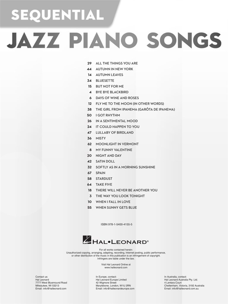 Students of all ages can play their favorites jazz songs with Sequential Jazz Piano Songs! Starting with the easiest arrangements (hands alone, very simple rhythms), and continuing in order of difficulty (including hands together, syncopated rhythms and moving around the keyboard), players can find songs that fit their particular skill level and play right away. Beginners can use these books to improve their music reading and piano skills from the very first page while playing the pop songs they love. This collection features 26 songs, including: All the Things You Are · Autumn Leaves · Bye Bye Blackbird · I Got Rhythm · Misty · Satin Doll · Take Five · The Way You Look Tonight · and more.