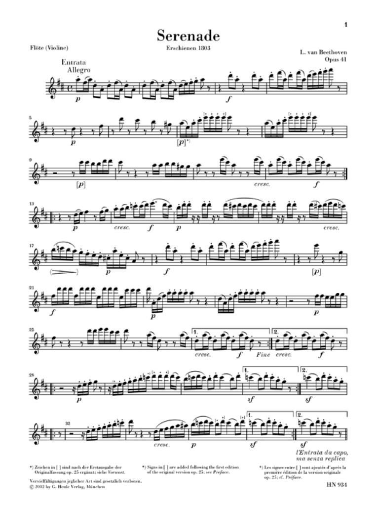 La Sérénade op. 41 renvoie à l'opus 25 pour flûte, violon et alto de Beethoven. L'arrangement pour piano et flûte (ou violon) n'est pas de la main de Beethoven, - mais probablement à attribuer au compositeur Franz Xaver Kleinheinz -, alors que Beethoven certifia en septembre 1803 à son éditeur Hoffmeister and Kühnel, qu'il l'avait "relue et même entièrement révisée par endroits". Adoubée par "Revue par l'Auteur", cette transcription se propagea rapidement. Partant des derniers résultats des spécialistes de Beethoven, nous présentons une version révisée de cette charmante sérénade (jusqu'à présent HN 301). Elle comporte de nouveaux textes détaillés relatifs à la genèse et l'état des sources.