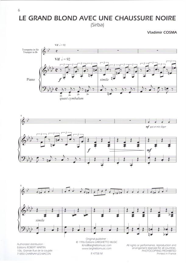 16 titres de Vladimir Cosma de ses plus belles musiques de film pour trompette et Piano. Recueil avec CD d'accompagnement et partition de piano.