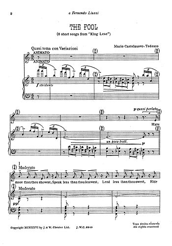 Like many composers who found themselves in exile during the war years, Castelnuovo-Tedesco composed in a very neoclassical and neoromantic style, reviving more traditional or antiquated ideas of melody, tonality and texture. His collection of Shakespeare Songs feature settings of verse from across the full range of the Bard's plays, and have proved to be great critical successes still widely performed today. Suitable to be adapted by most voices. the songs are interwoven with complex and thrilling Piano accompaniments that bring colour and energy to the often liberally edited texts. Book ten contains a set of six short songs adapted from King Lear .