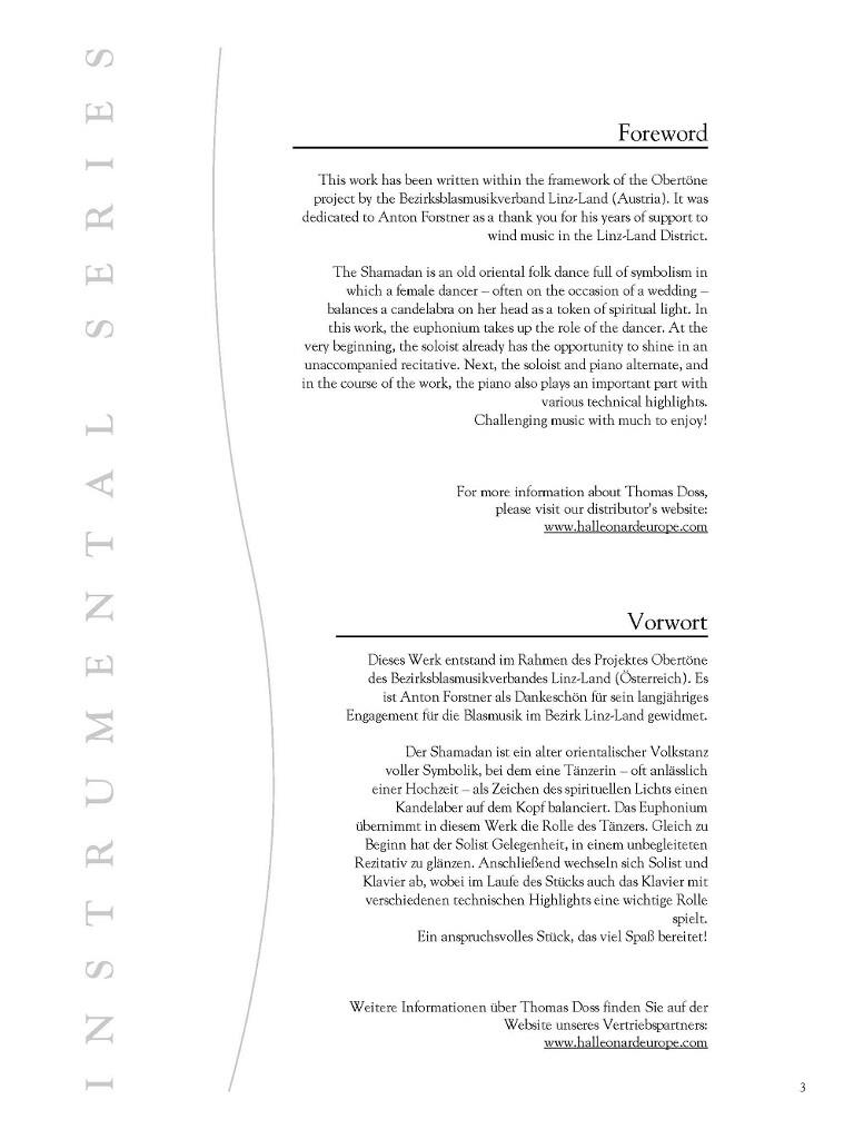 Cette œuvre a été écrite dans le cadre du projet Obertöne du Bezirksblasmusikverband Linz-Land (Autriche). Elle est dédiée à Anton Forstner en remerciement des années qu’il a consacrées à soutenir la musique pour instruments à vent dans le district de Linz-Land. Le Shamadan est une ancienne danse folklorique orientale pleine de symbolisme durant laquelle une danseuse – souvent à l’occasion d’un mariage – porte en équilibre sur la tête un candélabre représentant la lumière spirituelle. Dans cette œuvre, l’euphonium tient le rôle de la danseuse. Dès le début, le/la soliste a l’occasion de briller dans un récitatif non accompagné. Ensuite, soliste et piano jouent en alternance, mais tout au long de la pièce ce dernier tient aussi un rôle important avec diverses prouesses techniques. Une musique exigeante offrant de multiples plaisirs !