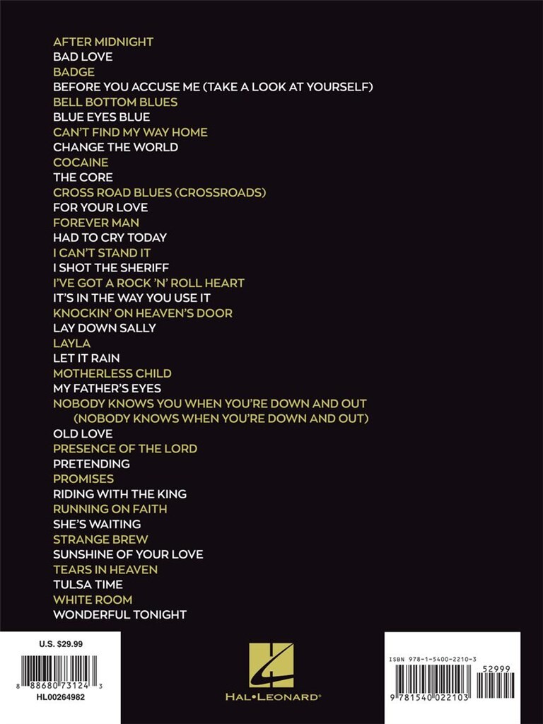 Bien que l'album "Slowhand" soit réputé pour son magistral jeu de guitare, ses chansons intemporelles sont également parfaitement réalisables au piano. Cette anthologie pour piano, voix et guitare comprend 38 des meilleures chansons de Clapton