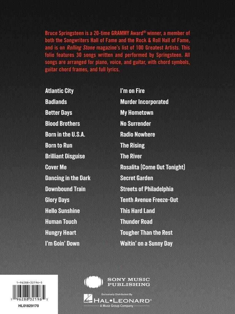 From Asbury Park to big stages worldwide, Bruce Springsteen's performances have filled hearts, moved crowds, and built a soundtrack for generations. That journey is reflected in this collection of 30 songs, each a milestone in Springsteen's decades-long legacy. Arranged for piano, voice, and guitar with chord symbols, guitar chord frames, and full lyrics, every score stays true to the spirit of the original. Whether you're reliving the moments that made you a fan or discovering his music for the first time, this collection lets you sit in with the E Street Band and ride down Thunder Road with songs from across Springsteen's storied career.