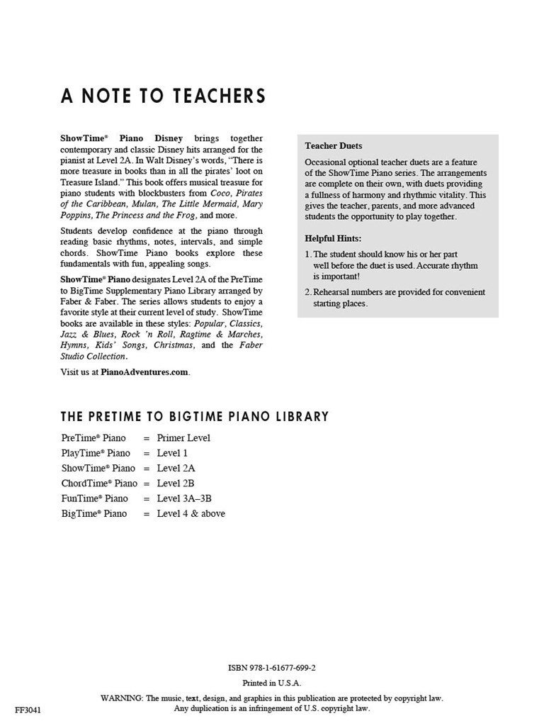 ShowTime Piano Disney presents contemporary and classic Disney hits arranged for the pianist at Level 2A. Students develop fundamental skills reading basic rhythms, intervals, and simple chords, all while playing appealing songs from favorite movies such as Aladdin, Pirates of the Caribbean, Mulan, and more.