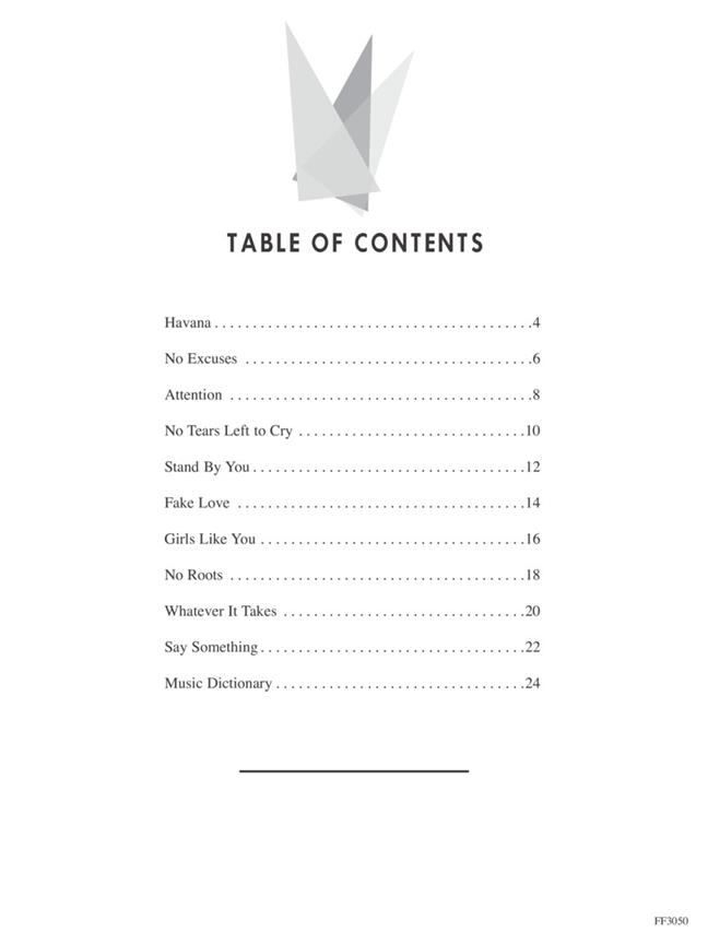 1. Attention 2. Fake Love 3. Girls Like You 4. Havana 5. No Excuses 6. No Roots 7. No Tears Left to Cry 8. Say Something 9. Stand By You 10. Whatever It Takes