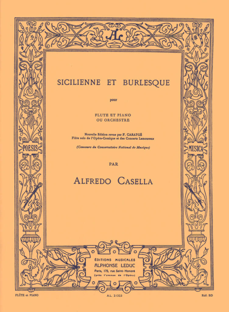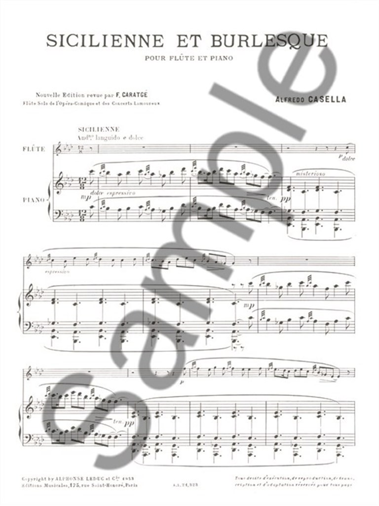 With a huge range of repertoire existing for the Flute, Italian composer Alfredo Casella 's Sicilienne et Burlesque stands out as an extremely evocative and inspiring piece, composed, notably, as WWI broke out across Europe. Having studied at the Paris Conservatoire from 1896 under the direction of Gabriel Fauré,CasellaCasella Casella received an exceedingly high standard of education. His clear compositional ability and understanding of the Flute is portrayed in his Sicilienne et Burlesque through the use of advanced Flute techniques and brilliant ensemble devices, exploiting the duet between Flute and Piano. The Sicilienne is in a slow, compound time, significantlycontrasted by the light and comedic Burlesque. These aspects combine to create an enjoyable and challenging piece for advanced flautists.