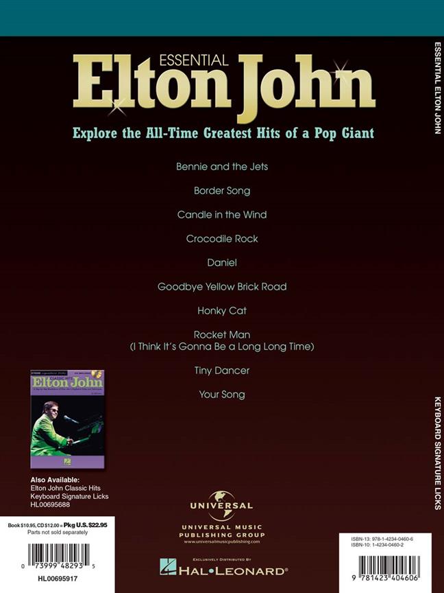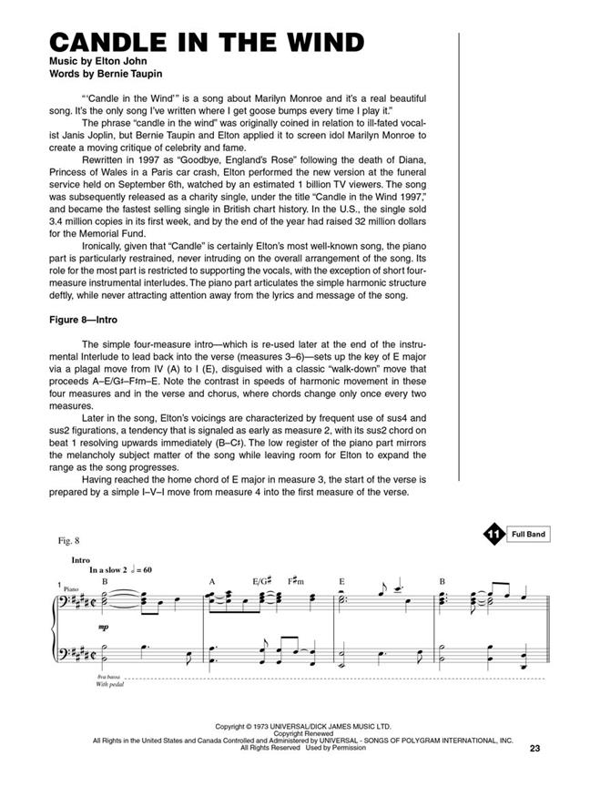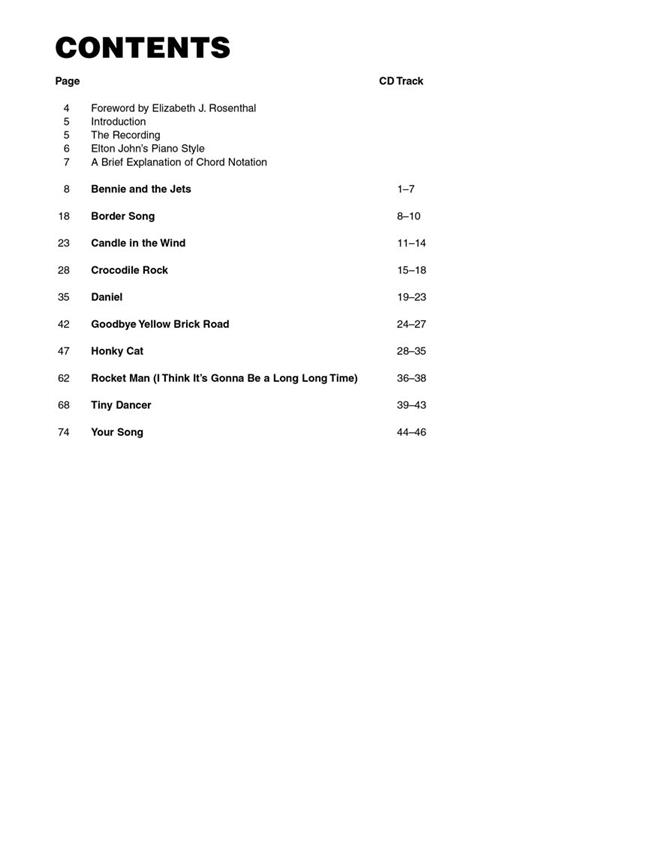 Explorez 8 chansons d'Elton John. Une analyse complète de styles et techniques de chaque morceaux (en anglais) + un CD audio conteant 2 enregistrements de chaque chanson : une démonstration normal + une version plus lente. Vous pouvez moduler le son du piano (isolé sur le mix stéréo) afin de jouer accompagné.