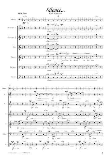 Écrire pour la voix... Cela m’a « enchantée »... La voix humaine est porteuse de multiples & remarquables richesses quant à toutes les possibilités qu’elle peut nous offrir. Mes recherches se sont alors dirigées vers le rythme & les sons, le timbre & les intensités, vers la & les couleur(s), vers la résonance... Par quoi ai-je débuté, je ne saurai vous le dire. Est-ce par la lecture & relecture de textes littéraires ou de textes musicaux? Musicalement, j’ai été guidé par Scelsi, Berio, Ligeti & Oscar Strasnoy. Mon travail s’est également engagé en direction du bruit. Mais qu’est-ce que le bruit ? qu’est-ce que le bruitage ? des chuchotements ? des accords en désaccords ? ou des accords qui assemblent, comme nous le dit Mozart , « des sons qui s’aiment » ? Mais quels sont ces sons qui s’aiment ? Quelles sont ces voix qui nous enchantent ? ...et pourtant... - Ruth Matarasso - « J’écoute le chant de l’oiseau non pour sa voix, mais pour le silence qui le suit » Noguchi Yonejiro