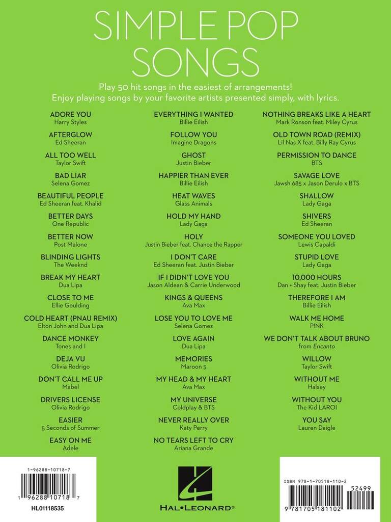 This big collection lets even beginners play 50 hit songs from today's top artists including BTS, Billie Eilish, Glass Animals, Selena Gomez, Halsey, Dua Lipa, Post Malone, Olivia Rodrigo, Ed Sheeran, Harry Styles, Taylor Swift, and more. Each song is presented in the easiest of arrangements for piano and include lyrics, perfect for sight-reading practice. Songs include: All Too Well · Bad Liar · Better Days · Better Now · Blinding Lights · Break My Heart · Close to Me · Cold Heart (PNAU Remix) · Dance Monkey · Drivers License · Easy on Me · Everything I Wanted · Heat Waves · Holy · If I Didn't Love You · Kings & Queens · Lose You to Love Me · Love Again · Old Town Road (Remix) · Permission to Dance · Shivers · Someone You Loved · Walk Me Home · Willow · Without Me · Without You · You Say · and more.