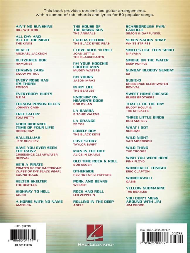 This collection features streamlined guitar arrangements, with a combo of tab, chords, and lyrics for 50 popular songs, including: Ain't No Sunshine · Beat It · Every Rose Has Its Thorn · Folsom Prison Blues · Hallelujah · Highway to Hell · I Love Rock 'N Roll · I'm Yours · In My Life · La Grange · Otherside · Pork and Beans · Rolling in the Deep · Smells like Teen Spirit · Sweet Home Chicago · Three Little Birds · Wild Night · Wish You Were Here · and many more.