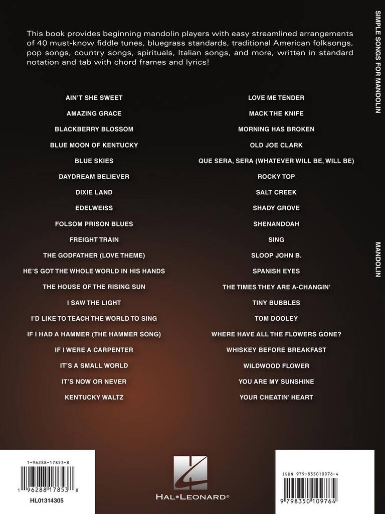 This book provides beginning mandolin players with easy streamlined arrangements of 40 must-know fiddle tunes, bluegrass standards, traditional American folksongs, pop songs, country songs, spirituals, Italian songs, and more. Written in standard notation with tab and chord frames and lyrics! Songs include: Ain't She Sweet · Amazing Grace · Blackberry Blossom · Blue Moon of Kentucky · Blue Skies · Daydream Believer · Dixie Land · Folsom Prison Blues · It's Now or Never · Morning Has Broken · Salt Creek · Tom Dooley · Wildwood Flower · You Are My Sunshine · and more!