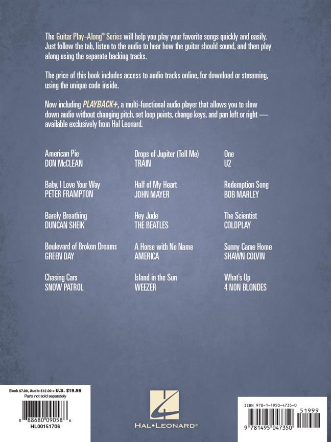 The Guitar Play-Along Series will help you play your favorite songs quickly and easily! Just follow the tab, listen to the audio to hear how the guitar should sound, and then play along using the separate backing tracks. The melody and lyrics are also included in the book in case you want to sing, or to simply help you follow along. The audio is available online for download or streaming, and it is enhanced so you can adjust the recording to any tempo without changing pitch! 15 songs: American Pie - Baby, I Love Your Way - Barely Breathing - Boulevard of Broken Dreams - Chasing Cars - Drops of Jupiter (Tell Me) - Half of My Heart - Hey Jude - A Horse with No Name - Island in the Sun - One - Redemption Song - The Scientist - Sunny Came Home - What's Up.