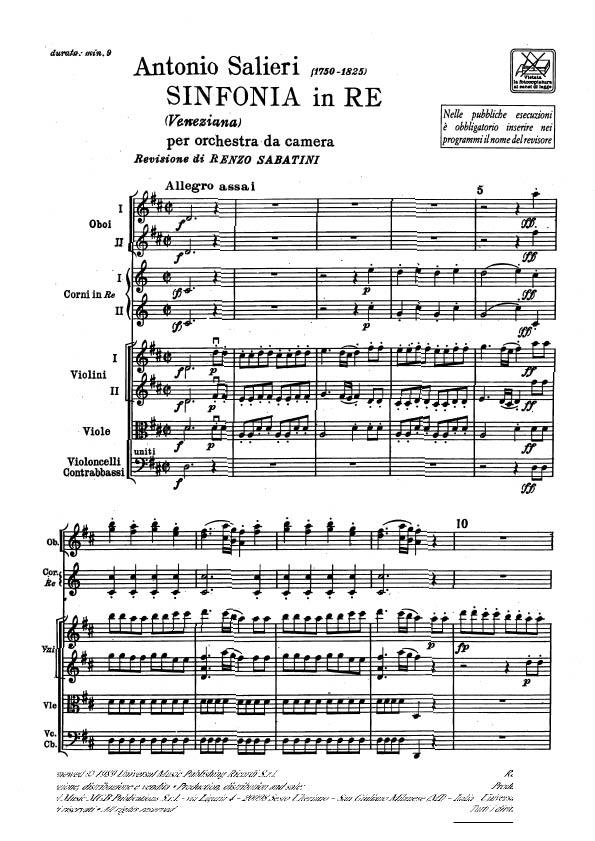 Sinfonia In Re Veneziana Per Orchestra Da Camera SALIERI ANTONIO