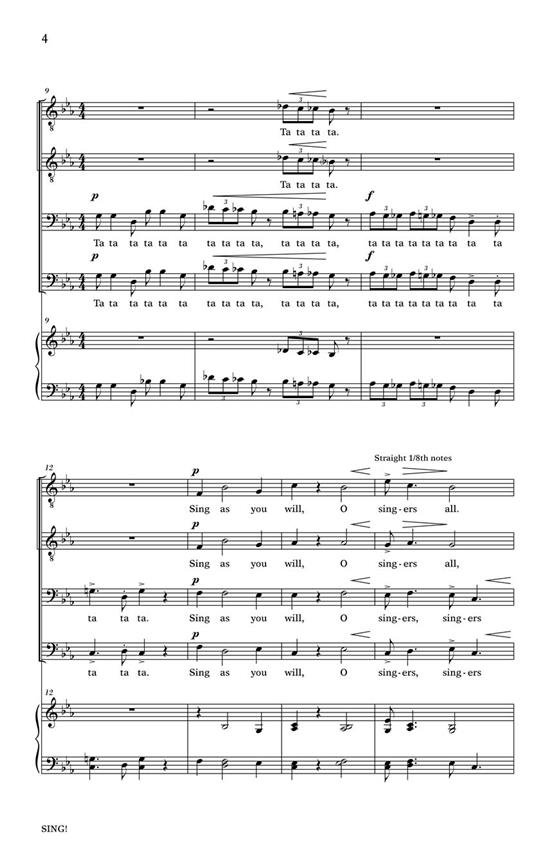Adaptant le texte du poème de James Whitcomb Riley A Song of Singing, voici une chanson pour hommes qui célèbre la joie et l’exubérance du chant. Avec une ambiance rapide et jazzy, les hommes chantent quelques mots mais surtout des sons sans monde pour capturer l’énergie du texte.