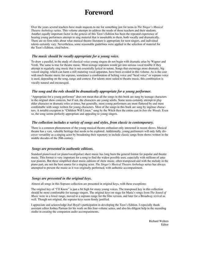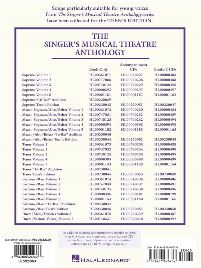 Soprano/Alto Edition. The Singer’s Musical Theatre Anthology: Teen's Edition is designed specifically for young performers, providing vocally and dramatically suitable material for teenagers. As part of the world's most trusted source for great theatre literature for singing actors, this collection includes songs carefully selected from a wide range of classic and contemporary shows. The book features authentic editions of each song, presented in original keys or thoughtful transpositions, and online audio files with piano accompaniments are provided. This anthology helps young performers explore musical theatre's rich heritage while ensuring the material is vocally appropriate and dramatically fitting for their age and experience.