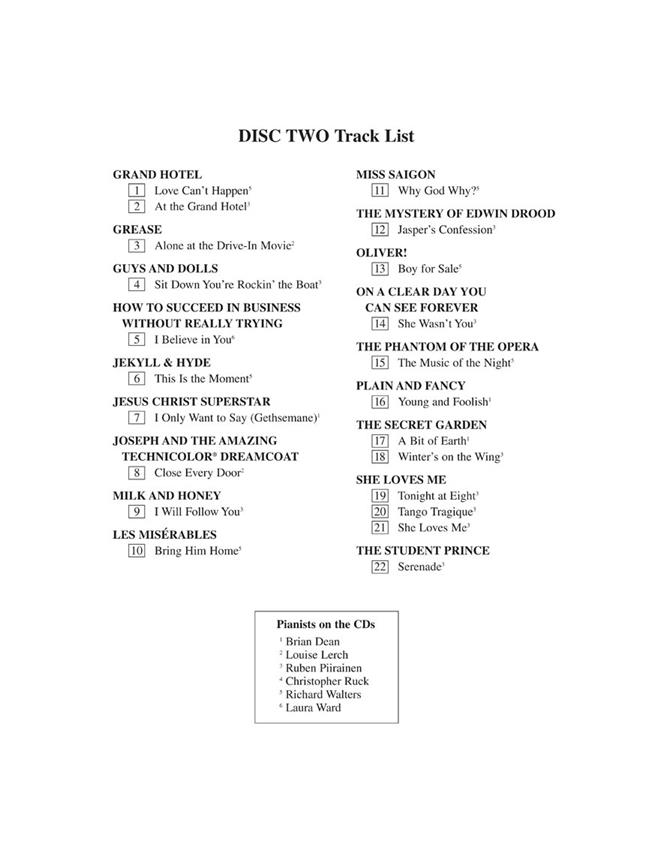 Deux CD d’accompagnement dans chaque coffret, correspondant aux livres contenant une collection de chansons issues de la scène musicale, classées par type de voix. Les sélections sont présentées dans leurs décors authentiques, extraits des partitions vocales originales.