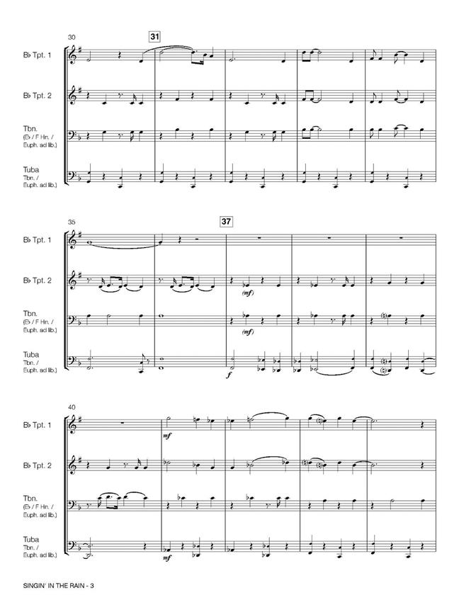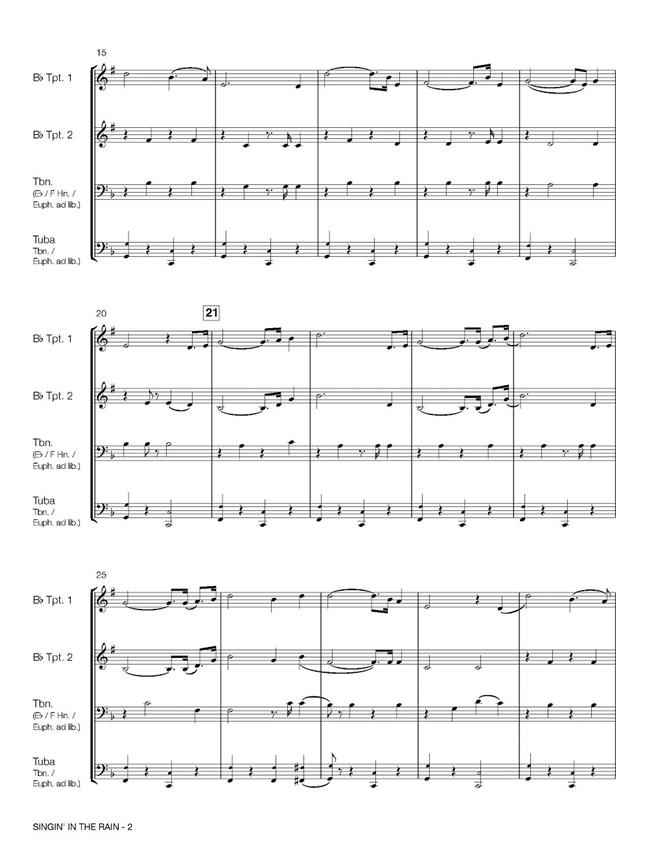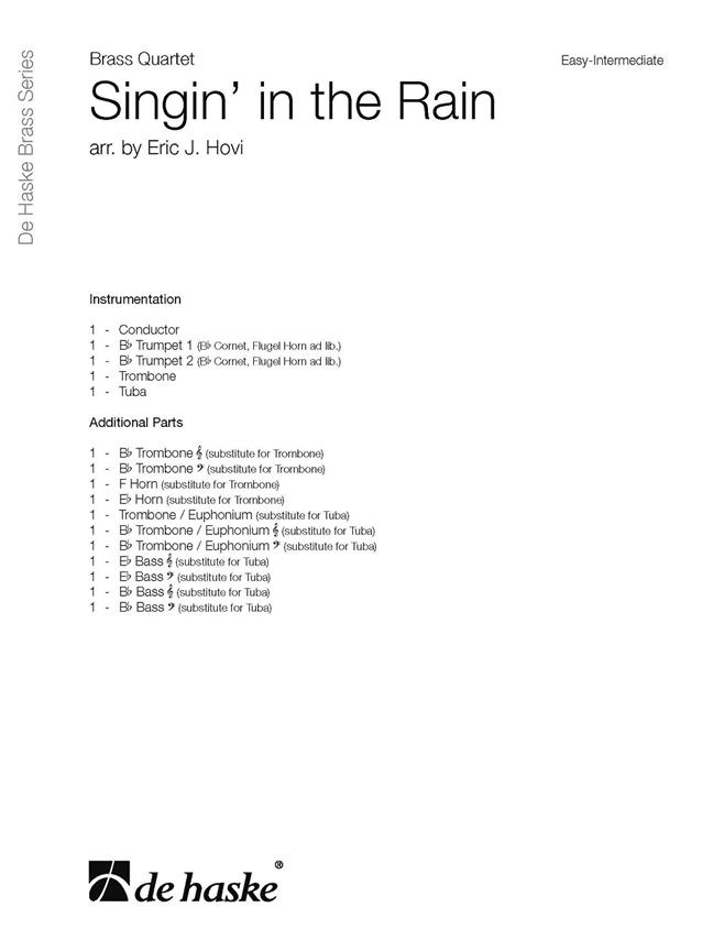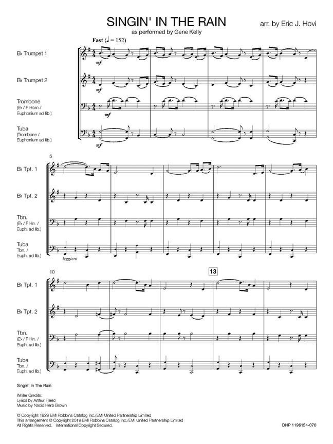 Dans le film du même titre, sorti en 1952, l'interprétation de cette chanson par Gene Kelly a séduit une multitude d'auditeurs au fil des années. " Singin' in the Rain " est parfaite pour tout type de quatuor, et Eic J. Hovi en a créé un arrangement facile pour quatuor de cuivres qui reste fidèle à l'esprit de la version originale.