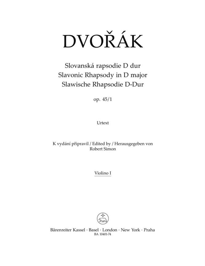 Dvoràk's ; Slavonic Rhapsodies Op. 45 were composed in 1878 and issued by the publisher Simrock, Berlin the following year. These three independent orchestral works (in D major, G minor and A-flat major) were published with the same opus number and mark the beginning of his so-called Slavonic period. The ; Slavonic Rhapsody Op. 45/1 in D major now appears in an Urtext edition. The editor, Robert Simon, has made use of the first edition, authorised by the composer, as the principal source of his new scholarly-critical edition. - A work marking the beginning of Dvoràk's so-called Slavonic period - Urtext edition incorporating every known source - Foreword (Eng/Cz/Ger) and Critical Commentary (Eng) by the editor - Full score & parts (BA10401) available for sale