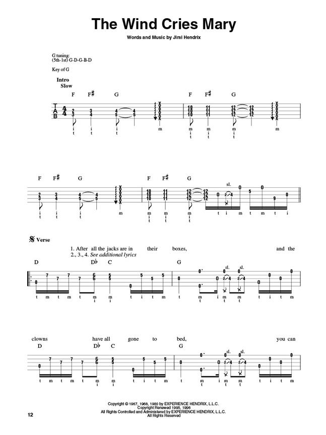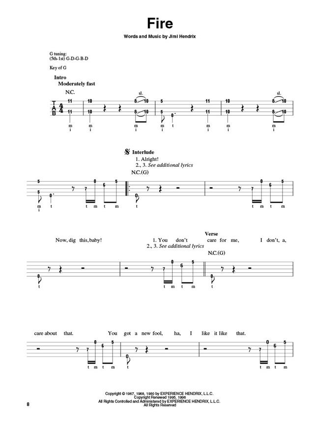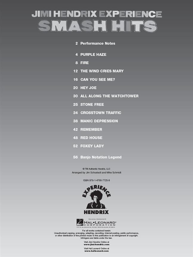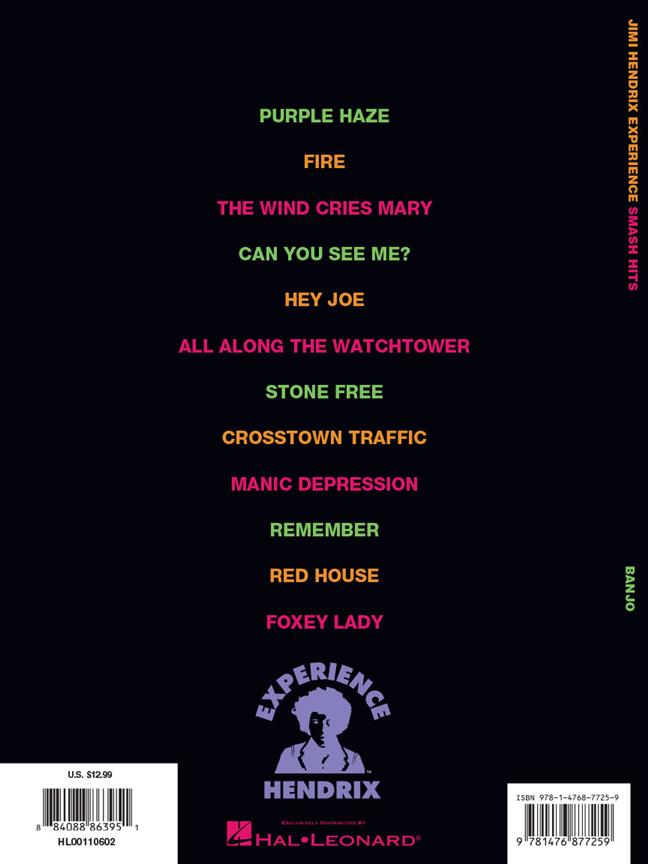 Jimi Hendrix: Smash Hits For Banjo dispose de 12 coups par le guitariste légendaire, avec les paroles, arrangé spécialement pour cinq cordes de banjo. Les chansons incluent Purple Haze, The Wind Cries Mary, All Along The Watchtower et plus.
