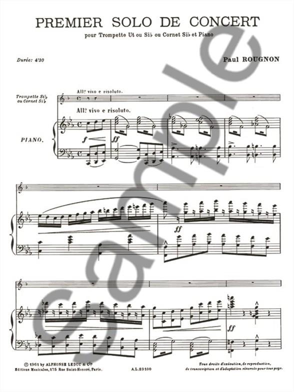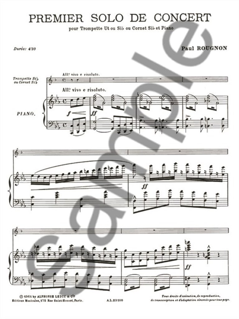 French composer, pianist and teacher, Paul Rougnon (1846-1934) studied at the Paris Conservatoire under many prolific musicians of the time, including Cesar Franck. Rougnon 's composition catalogue is extensive, with many works remaining popular to this day, including his First Concert Solo for Trumpet or Cornet and Piano. The date of composition is unknown, however Rougnon 's First Concert Solo displays characteristics of early, French romantic music, such as chromaticism, flourishing semiquaver passages, complex rhythms and extensive use of performance directions. For all advanced, aspiring Trumpetand Cornet players, Rougnon provides an alternative, exciting performance work.