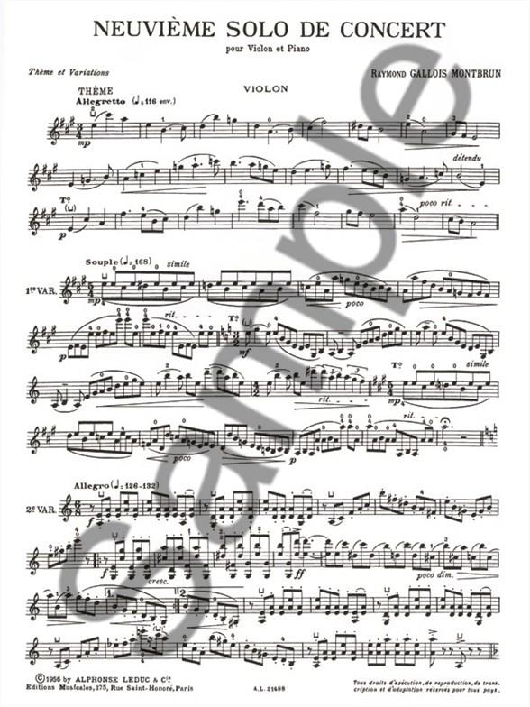 Part of the collection ; Concert Solo, Neuvième Solo is a contemporary and modern piece by Raymond Gallois Montbrun, for Violin and Piano. Quite difficult, this piece should prepare upper-intermediate players to play classical concertos. This really nice piece is composed of a main theme, four variations and a final. The theme is quite lyrical and has an Allegretto tempo. The fourth theme stands out by its extensive use of harmonies. The Piano accompaniment also evolves based on the variations. The piece finishes on a really harmonious final. Raymond Gallois Montbrun (1918-1994)was a French violinist and composer who won the Premier Grand Prix de Rome and the Grand Prix de Paris. He later became the director of the Paris Conservatoire. He composed many symphonic pieces, an opera, a quartet and many pieces for Solo Piano, Violin and Piano and other instruments.