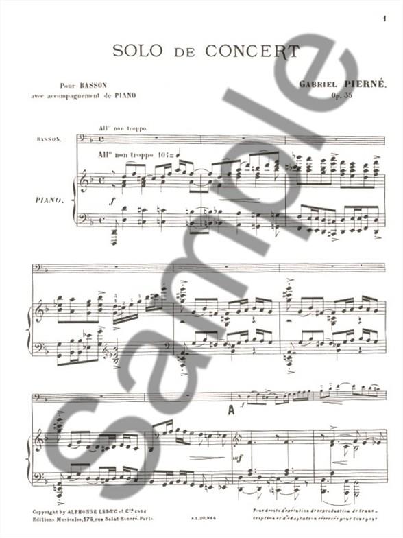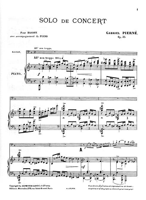 Gabriel Pierne (1863-1937) was a French composer, conductor and organist. Despite being predominantly remembered as a conductor, his Solo De Concert remains a recognised piece in the Bassoon repertoire. Pierne studied at the Paris Conservatoire before taking up the position of chief conductor for the concert series, Concerts Colonne in 1910. He remained in the post until 1933, and during this time, he notably conducted the world premiere of Igor Stravinsky 's The Firebird. Pierne composed for a variety of instruments, Concert Solo for Bassoon being one offour solo works by the composer. This Pierne piece for Bassoon contains many characteristics typical of the French style, such as significant tempo changes and performance directions, flourishes of semiquavers, chromaticism and many alterations in dynamics. Concert Solo is a varied piece essential to the repertoire of aspiring bassoonists.