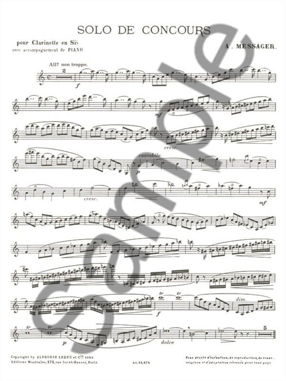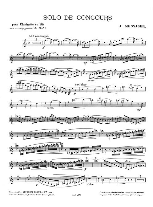 Andre Messager (1853-1929) composed Solo De Concours for Clarinet in 1899, as a Paris Conservatoire Contest piece. Composed in three sections, the cheerful first part contains triplet figures by the Clarinet that can easily be heard over the Orchestra. The second part has a strong French melody that can be heard as an exchange between the Clarinet and the Orchestra. A cadenza followed by trills ends this section and leads to the final part, where the Clarinet stands out from the Orchestra, with a rich melodic energy. Andre Messager is a previous student of Gabriel Faure and CamilleSaint-Saë ns who wrote numerous operas, operettas and ballets. He was later appointed Commander of the Legion d'Honneur.