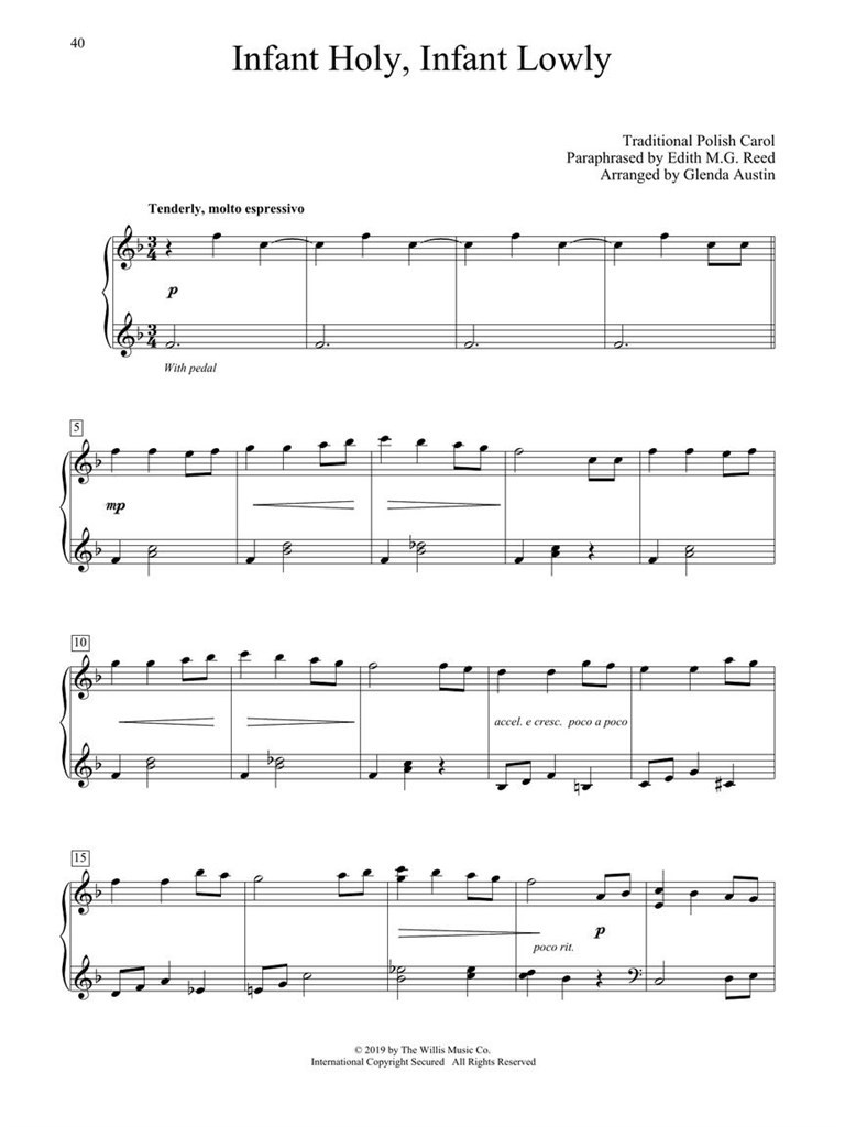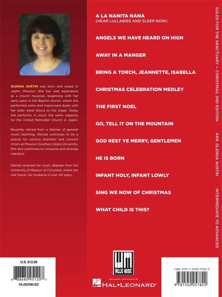 12 exciting piano solos! This 2nd edition features old favorites as well as new arrangements of Glenda's favorite Christmas carols. They can be used for church or recital performances, or simply for personal enjoyment. Titles: A La Nanita Nana (Hear Lullabies and Sleep Now) - Angels We Have Heard on High - Away in a Manger - Bring a Torch, Jeannette, Isabella - Christmas Celebration Medley - The First Noel - Go, Tell It on the Mountain - God Rest Ye Merry, Gentlemen - He Is Born - Infant Holy, Infant Lowly - Sing We Now of Christmas - What Child Is This?