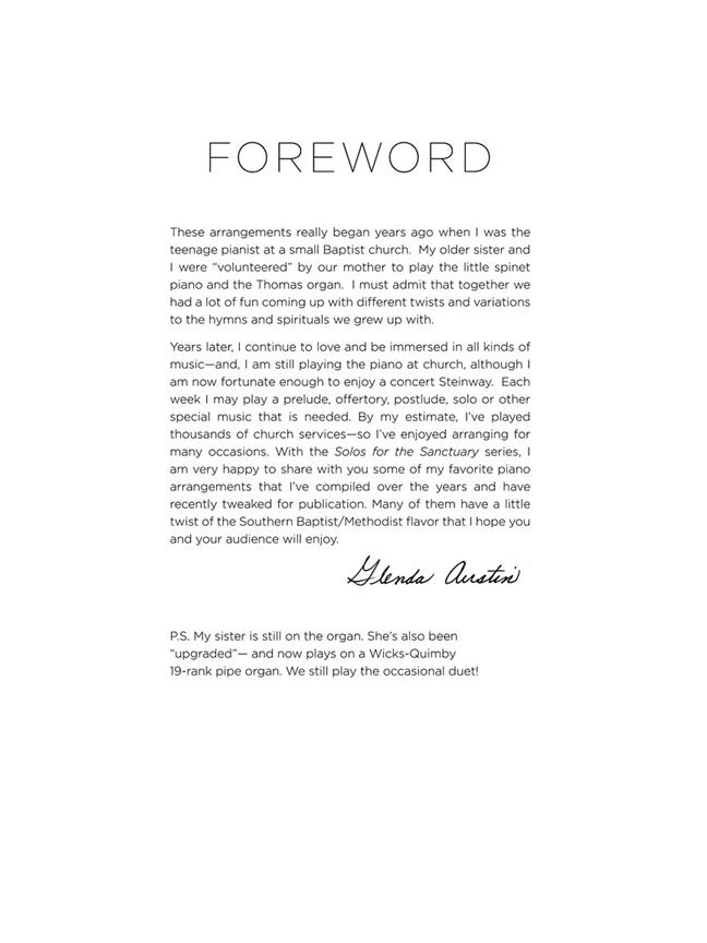 Solos de piano passionnante pour l'église pianistes partout! Ces excellentes dispositions par Glenda Austin inclure certains de ses cantiques préférés qui peuvent être utilisés pour des spectacles et considérant l'église, ou tout simplement pour votre plaisir personnel.