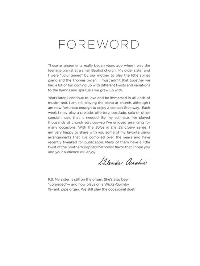 Solos de piano passionnante pour l'église pianistes partout! Ces excellentes dispositions par Glenda Austin vont de très rythmique d', lyrique et calmante et notamment certains de ses spirituals préférés. Peut être utilisé pour des spectacles et considérant l'église, ou tout simplement pour votre plaisir personnel.