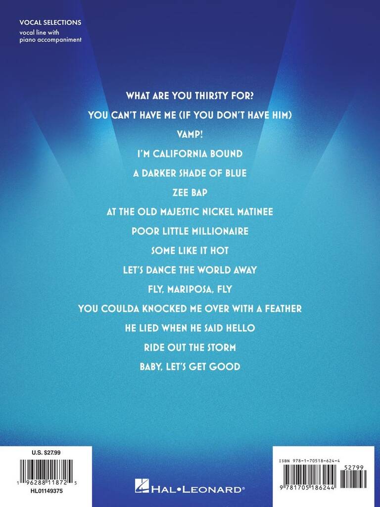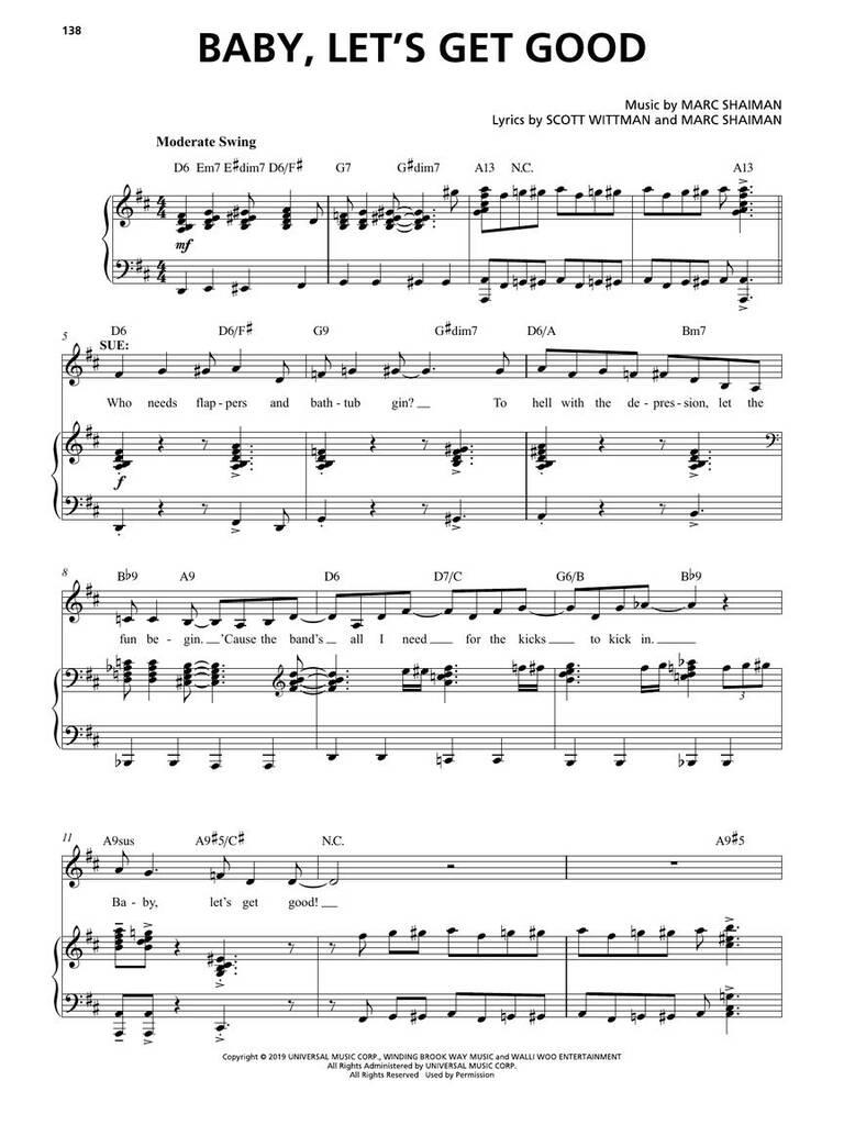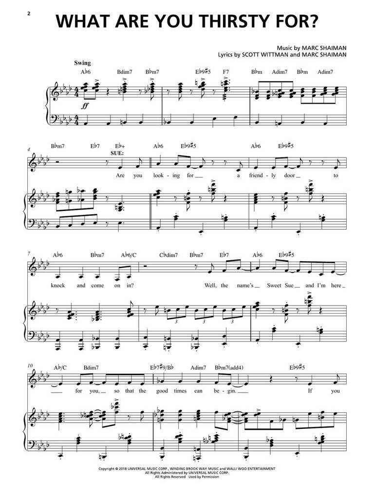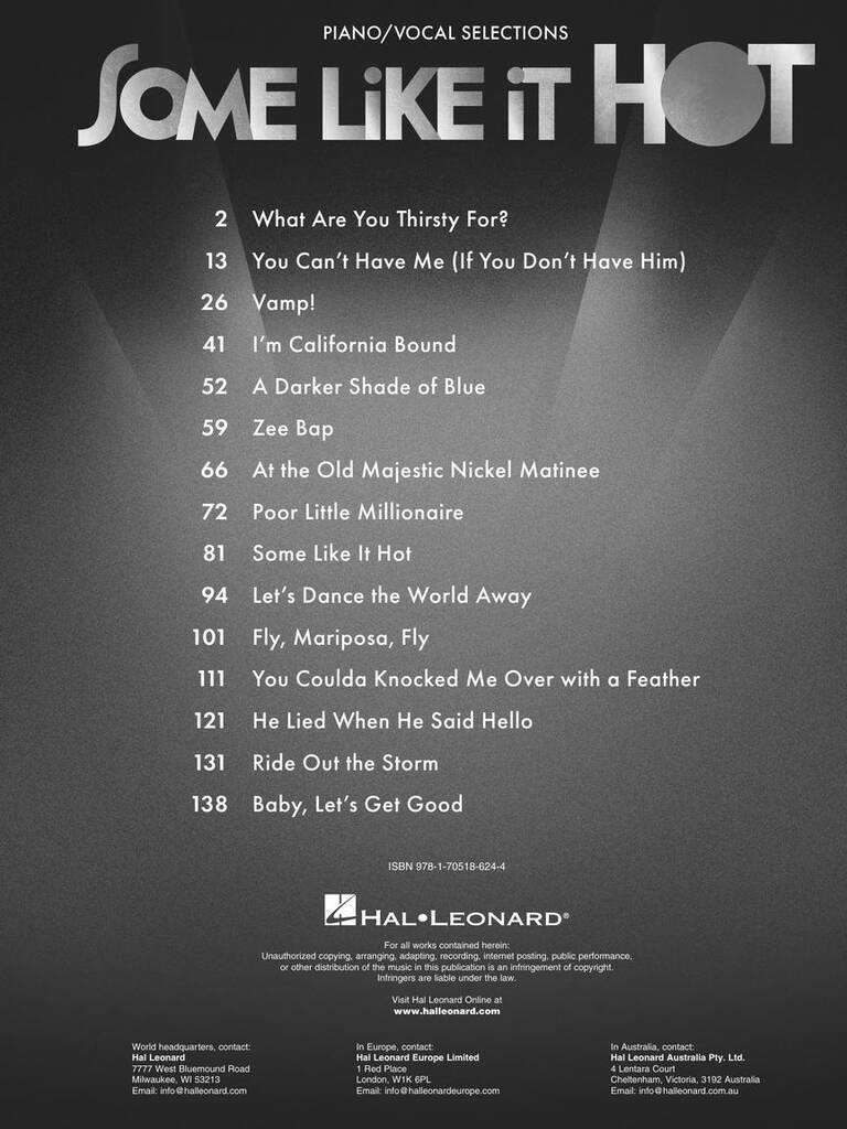 Set in Chicago when Prohibition has everyone thirsty for a little excitement, Some Like It Hot is the glorious, big, high-kicking (Associated Press) story of two musicians forced to flee the Windy City after witnessing a mob hit. With gangsters hot on their heels, they catch a cross-country train for the life-chasing, life-changing trip of a lifetime. This smash hit features infectious music by Marc Shaiman and lyrics by Shaiman and Scott Wittman. Our folio includes 15 songs from the show arranged with vocal line and piano accompaniment. Titles include: At the Old Majestic Nickel Matinee · Baby, Let's Get Good · A Darker Shade of Blue · Fly, Mariposa, Fly · He Lied When He Said Hello · I'm California Bound · Let's Dance the World Away · Poor Little Millionaire · Ride Out the Storm · Some like It Hot · Vamp! · What Are You Thirsty For? · You Can't Have Me (If You Don't Have Him) · You Coulda Knocked Me over with a Feather · Zee Bap.