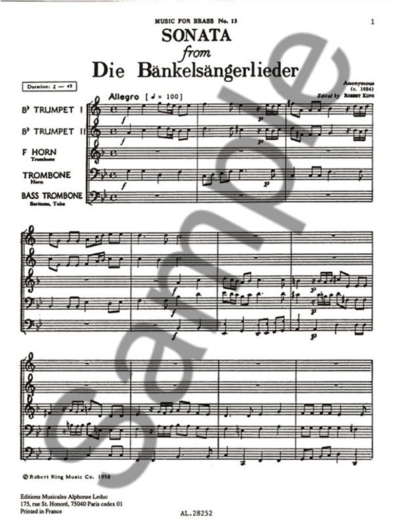 Sonata from Die Bänkelsängerlieder is a piece for Brass Quintet: two Trumpets, a Horn, a Trombone and a bass Trombone. The general level of this Sonata is intermediate / upper intermediate for all instruments. Found among some music sheets bought in the auction of the effects of one Dr. Gehring, this sonata is the nineteenth piece was considered as one of the best musical sheets found. The title ; Die Bänkelsängerlieder means ; The bench singer, to be understood as the itinerant musician who is singing about the stories he witnesses every day. A more detailed story of the piece is written as apreface for this volume. Lasting 2 minutes 45, this piece has a very nice melody and is perfect for recitals.