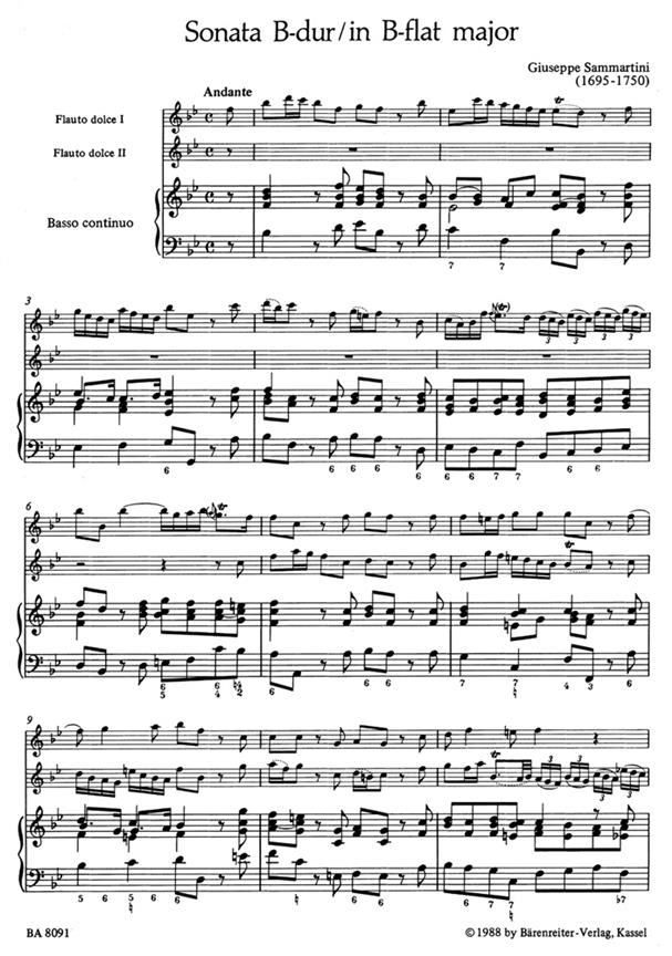 Score with lightly realised (and figured) Basso Continuo and 3 parts (Treble Recorder I, II, Basso Continuo) Giuseppe Sammartini (1695-1750) was already famous as an oboist in Italy before distinguishing himself in England as a composer and virtuoso. In this edition we have transposed his Trio Sonatas for two Flutes or Violins to a range ideally suited to the Treble Recorder. The work was popular during Sammartini 's lifetime and stands out because of its melodic richness and imaginative treatment of counterpoint and harmony.