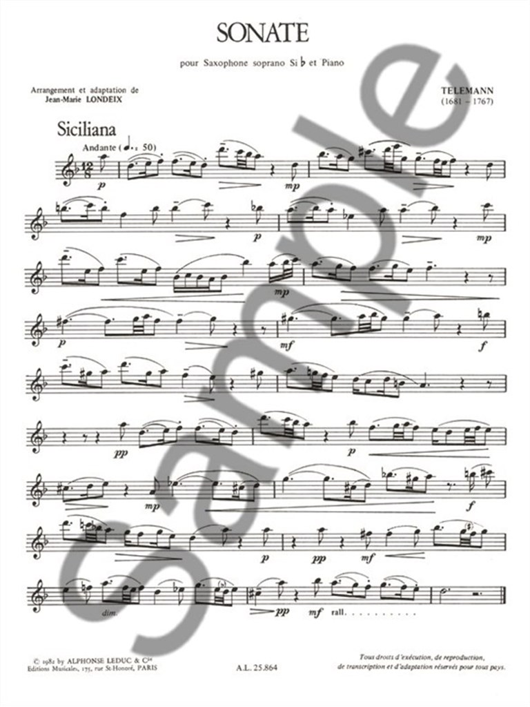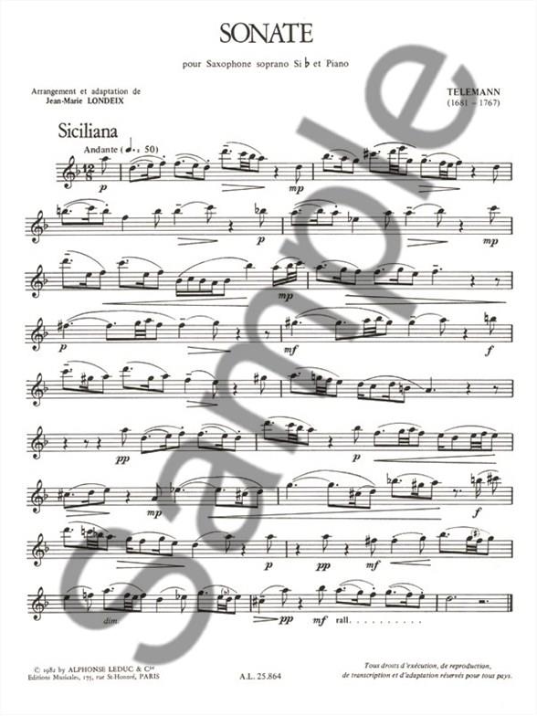 Sonata is a piece for Bb Soprano Saxophone and Piano composed by G. P. Telemann (1681-1767) and reviewed by Jean-Marie Londeix. Highly melodious, this piece, subtitled ; Sicilianna, is quite challenging (upper intermediate/advanced level) and lasts 7 and a half minutes. The four parts of this piece are: 1. Andante (12/8 & tempo 50), 2. Spiritoso (3/4 & tempo 100), 3. Andante (4/4 & tempo 72) and Vivace (2/4 & tempo 120). Jean-Marie Londeix is a musician who studied the Saxophone and the Piano. He also had some strong knowledge of chamber music, harmonies and of music history and obtained aFirst Prize and a Prize of Honour at the Paris Conservatoire.
