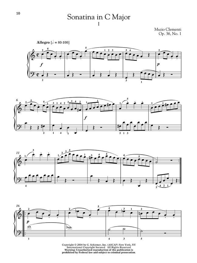 Schirmer Editions de performance présente l'ensemble des Six Sonatines Opus 36 par Muzio Clementi. De Clementi Opus 36 est aujourd'hui la plus connue de toutes ses oeuvres, et à ce jour tout étudiant de piano grave ou interprète sera familiarisé avec au moins un de ces morceaux de concert délicieux. Avec un grand sens de l'éclat mélodique, la précision et la vitalité rythmique, ces courtes pièces sont essentiels pour le nouvel étudiant de piano, aidant à développer un son clair, la régularité du toucher et le contrôle dynamique.
