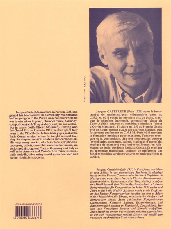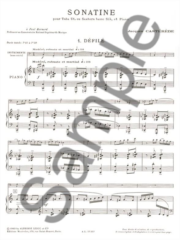 Sonatina by Jacques Casterède is a piece for C Tuba or Bb Saxhorn and Piano. This work is quite romantic but it can be difficult and technical to execute. It would be recommended for advanced players. Composed in three distinct parts, this Sonatina lasts between 7'15 and 7'30. These three sections are: - Defile - Serenade - Final Jacques Casterède (1926-2014) is a renowned composer and pianist. He has won the Grand Prix de Rome in 1953 and has composed numerous melodic pieces including ballets, concertos, symphonies, ensemble and chamber music.