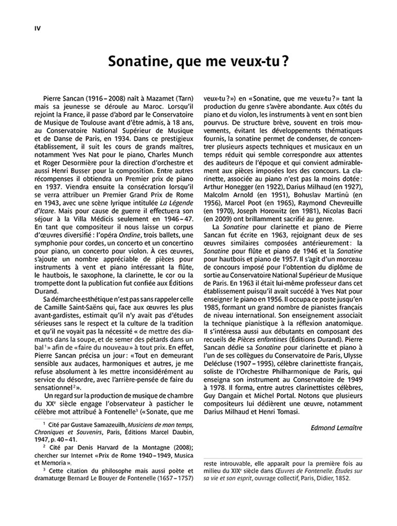 « Musique française » est une collection conçue pour les étudiants, les professeurs et les interprètes professionnels. Les volumes, qui présentent une analyse des chefs-d’œuvre de la musique française, offrent de précieux conseils d’interprétation et des commentaires de caractère historique et stylistique rédigés par de grands professeurs. Pierre Sancan a écrit cette Sonatine pour clarinette et piano en 1963. Compositeur reconnu, il a d’abord marqué son époque comme pianiste et pédagogue hors pair. Cette pièce, au format court et condensé, est construite en trois brefs mouvements enchainés. Elle est parfaitement calibrée comme une pièce de concours de sortie du Conservatoire de Paris. Le clarinettiste y est invité à démontrer toutes ses qualités techniques, musicales et sonores dans un espace restreint.