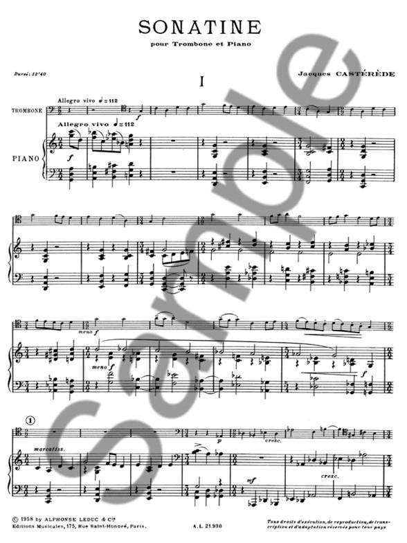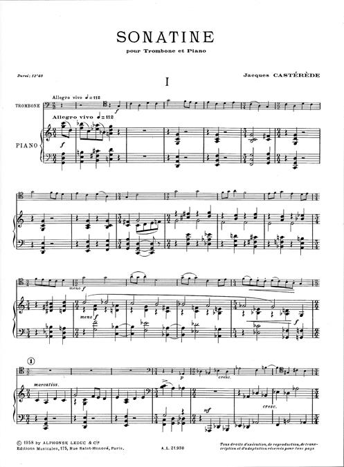 After hearing Castèréde 's Sonatine for Trombone and Piano, the realisation that his music remains in the shadows of his French contemporaries is one that is hard to fathom. Should you be a fan of Messiaen, then Castèréde 's Sonatine is one for you. Having won prizes in Piano, chamber music, harmony, composition, analysis and aesthetics in music whilst studying at Paris Conservatoire, it is not surprising that the composer's Sonatine for Trombone and Piano is full of musically appealing features. Elements include exquisite use of ornamentation, exploiting Trombone technique to its full potential, and clever uses of shared melody between the Trombone and Piano. From the livelyand harmonically rich first movement to the luscious melodies of the second, this Sonatine provides an enjoyable listen and fun piece to learn for all trombonists.